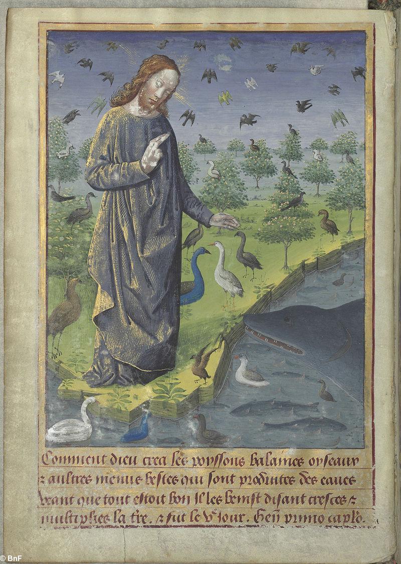 - Heures de Louis de Laval, BnF ms lat. 920 : f° 4v, Dieu créateur des poissons et des oiseaux.