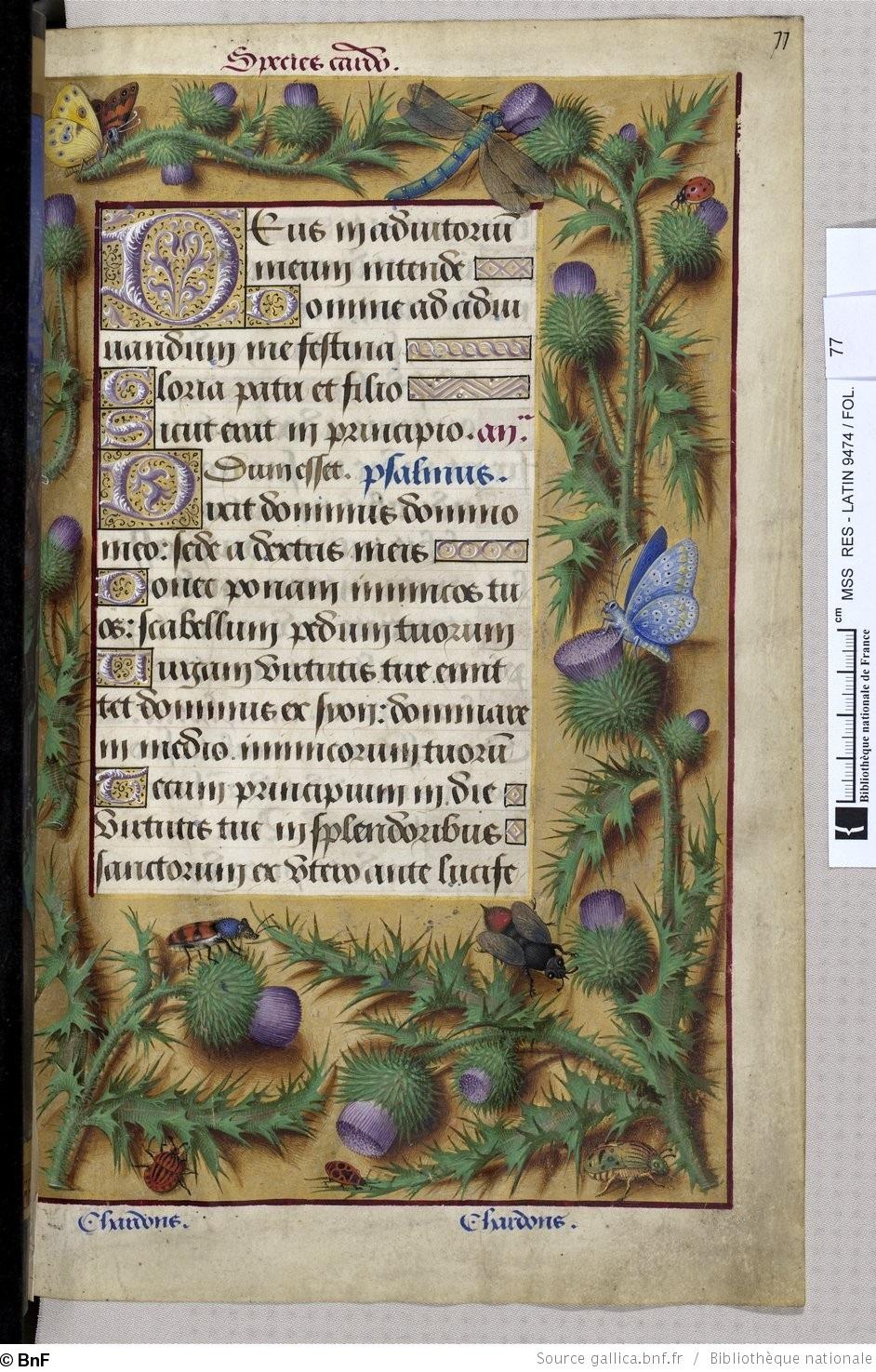 - Le Grand livre d'Heures d'Anne de Bretagne f° 77r : Spectes cardo et chardons.