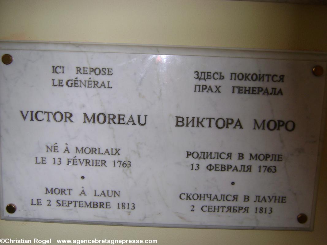 Le citoyen de l'Europe,Victor Moreau, et la postérité Moreau reçut des hommages exceptionnels de la part des souverains alliés, mais, les royalistes français ne pouvaient s'y associer sans réserve, car, ils savaient bien qu'il était athée et républicain dans l'âme et n'avait conseillé le Tsar, franc-maçon comme lui, que, pour faire cesser les boucheries humaines en Europe. C'est pourquoi, on peut le qualifier de « citoyen de l'Europe ». Les archives, tant néerlandaises, qu'allemandes et autrichiennes indique qu'il a toujours su empêcher les pillages et les vexations vis-à-vis des habitants occupés et c'est cela qui a créé et maintenu sa grande réputation en Europe et dans le monde à son époque et, maintenant, en Allemagne et en Autriche, même dans les régions où il a vaincu et qu'il a occupées. Il n'y a qu'en France qu'elle n'est pas reconnue et que la basse vengeance d'un dictateur, coupable de dizaines de milliers de morts inutiles, le poursuit. Son cercueil repose dans la crypte de l'église Sainte-Catherine, mais, n'est pas visible, à cause des dégâts créés par un incendie. Le Tsar a fait inscrire sur la tombe « Moreau, chevalier de l'Humanité ». A l'entrée à gauche, on peut voir une plaque de marbre indiquant que le maréchal repose ici, avec une épitaphe en français : Guide de l'éternité, il ne vécut sur cette terre que pour mourir dans la carrière qui mène à l'immortalité. En 1814, lors du premier retour du Roi, Moreau, en même temps que Georges Cadoudal est élevé à la dignité de Maréchal de France à titre posthume. Ce titre ne lui a pas été retiré et doit donc lui être donné. Le Roi, Louis-Philippe, qui fit achever la construction de l'Arc de Triomphe de l'Étoile en 1836, demanda qu'on y inscrive les grands militaires de toutes les armées de 1789 à 1815. Le nom de Moreau figure donc en tête de la liste apposée sur le pilier Est. Les jambes de Moreau furent enterrées sous un monument construit en 1814, à l'endroit où il fut frappé, sur les hauteurs de Räcknitz, une banlieue urbanisée, au Sud de la ville de Dresde. On y voit dans un square près de barres d'immeubles, un immense casque de bronze surmontant une stèle de granit. http://www.openstreetmap.org/?mlat=51.02308675646782&mlon=13.735750615596771&zoom=18 En 1998, sur une initiative allemande, un monument commémorant la bataille de Hohenlinden a été érigé, sur place, sous la forme de quatre piliers supportant un cadre horizontal. www.openstreetmap.org/?mlat=48.15638065338135&mlon=11.97735071182251&zoom=16 Le Musée des Beaux-Arts de Brest possède une huile d'Auguste Couder, peinte en 1814,Le général Moreau dictant ses dernières volontés à son ami et aide de camp, le colonel Rapatel. L'ingratitude de la Ville de Morlaix Alors que le deux-centième anniversaire de la mort de Moreau approche, ce serait l'occasion de cesser de le traiter comme un paria, alors que c'est toujours pour de nobles raisons qu'il a agi. La Ville de Morlaix s'est montré particulièrement ingrate, vis-à-vis d'un personnage historique de grande dimension. Elle lui a rendu un beaucoup trop modeste hommage en installant un bas-relief en bronze figurant le maréchal dans le Square de la Madeleine, œuvre d'ailleurs offerte par la ville de Hohenlinden (??!!). Aucune voie ou place ne porte le nom d'un des plus talentueux de ses fils dans sa ville natale. Pourtant, personne n'est obligé de prendre Napoléon comme mesure de la vertu républicaine et d'imiter son intolérance. Victor Moreau a été un authentique républicain et Napoléon, l'assassin de la république en laquelle son rival militaire croyait. Frédéric Hulot, historien spécialisé dans les biographies des militaires de la période Révolution-Empire, conclut son livre, publié en 2001, et qui veut « rétablir la vérité historique » : « La France s'est montrée injuste, vis-à-vis de ce grand Français, qui, pour employer la formule de son époque, avait pourtant bien mérité de la patrie ».