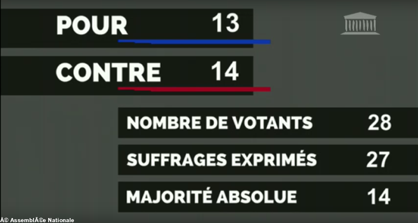 Malgré l'adoption successive en séance des 5 articles de la proposition de loi, contre l'avis du gouvernement, celle-ci a été rejeté lors du vote final, par 14 voix contre 13, à l'occasion du scrutin public demandé par les députés socialistes, qui leur a permis de voter pour le compte de parlementaires absents de l'hémicycle.