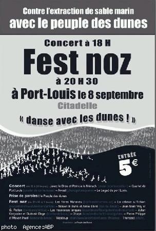 Dans le cadre de sa lutte contre le projet d'extraction de sable par le groupe Lafarge, en mer au large d'Erdeven, le collectif « Le Peuple des Dunes », qui regroupe 140 associations, organise une grande soirée de soutien « Danse avec les Dunes » le samedi 8 septembre dans la citadelle de Port Louis : "concert à 18 h" puis "fest noz à 20 h 30".