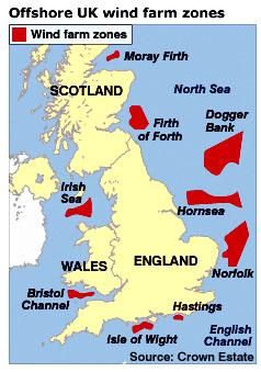 Neuf zones ont été choisies, et pour certaines allouées à des entreprises britanniques, suédoises et norvégiennes, pour fournir 32 gigawatts, le quart des besoins électriques du Royaume. Les travaux ont commencé et certains sites existent depuis 2000.
