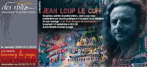 Sculpteur, peintre et poète breton, Jean-Loup Le Cuff présentera son œuvre poétique à l'occasion de la réédition de son ouvrage « Les Trois Songes de Kernunnos » aux éditions Les Chemins Bleus / Hentoù Glas dans le cadre des soirées littéraires organisées par l'association "des rives" (2) qui fera ainsi sa rentrée.