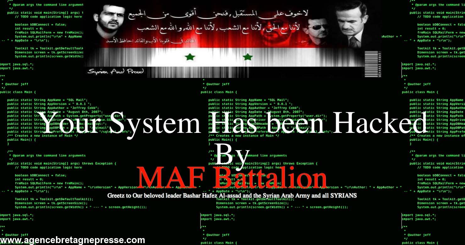 Depuis le 2 avril, le site de l'Agence Bretagne Presse fait l'objet d'attaques répétées. A 22 heures, hier soir, les hackers se réclamant du groupe syrien pro-Assad MAF Battalion avaient réussi à insérer leur propre page d'accueil (voir notre copie d'écran) et effacé tous les fichiers. Une fois que ceux-ci aient été remis en ligne, l'attaque a été renouvelée le 4 au matin.