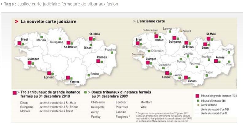 Dans Le Télégramme d'aujourd'hui, la carte judiciaire bretonne ne représente que la région administrative. C'est le comble ! Alors que justement le ministère de la Justice a respecté l'intégrité de la Bretagne dans sa récente réforme