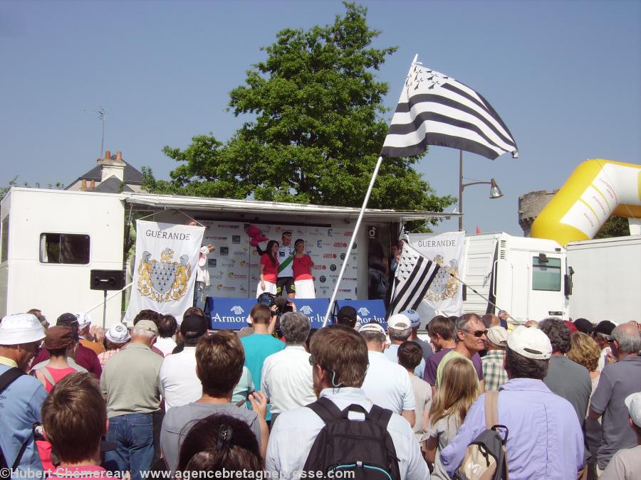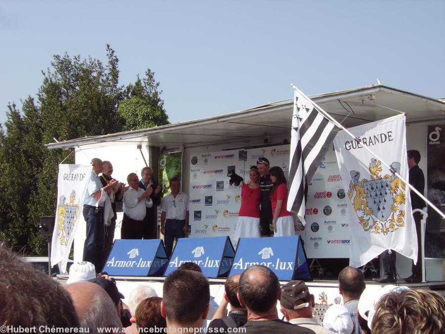 Après l'arrivée prévue à 16 h 29 boulevard de l'Abreuvoir, la remise des maillots de l'étape s'est faite en présence du député maire de Guérande Christophe Priou et du conseiller général et maire de La Turballe René Leroux et de Bernard Hinault.