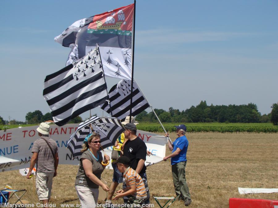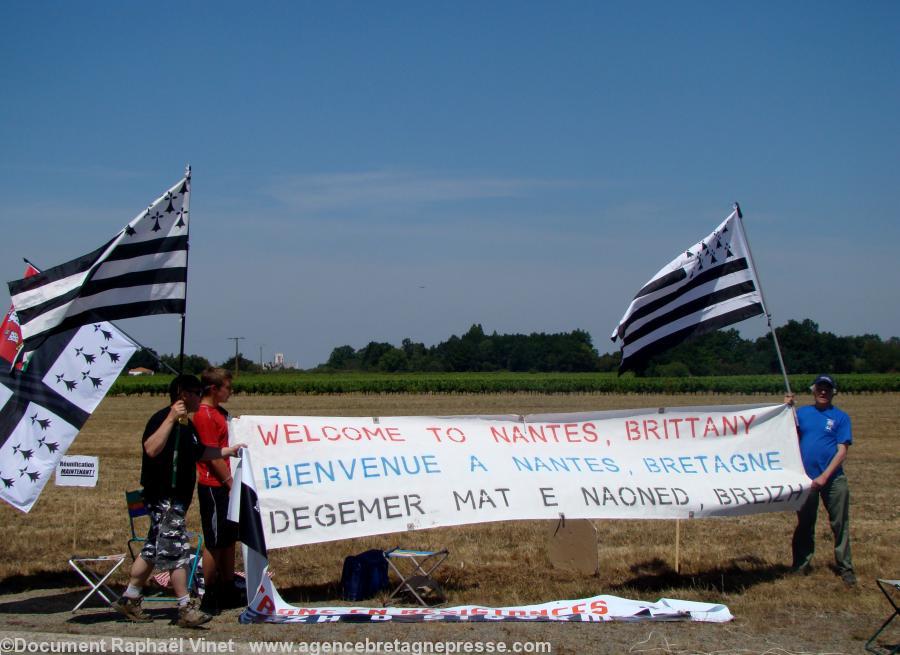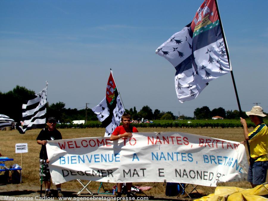 Puis, se dirigeant vers le bord de la route au carrefour, attendant la caravane publicitaire, les membres de Bretagne Réunie exposent leurs banderoles en criant chaque fois que possible « Bienvenue en Bretagne » au dessus de leurs banderoles, sous leurs drapeaux de Bretagne et sous un soleil généreux : des Gwenn ha Du, des drapeaux du Pays de Retz et de la Ville de Nantes. D’autres drapeaux se trouvent dans le public, plus bas et plus haut que le carrefour. Cela attire l’oeil des camionnettes publicitaires.