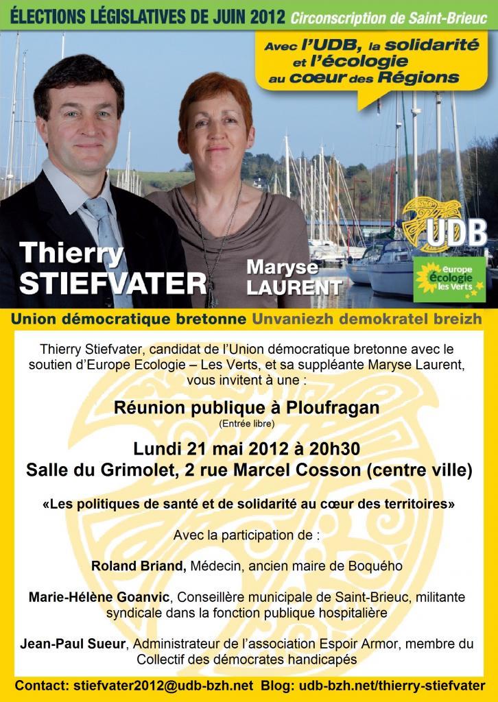 Thierry Stiefvater, candidat de l'Union démocratique bretonne avec le soutien d'Europe Écologie – Les Verts, et sa suppléante Maryse Laurent, vous invitent à une éunion publique à Ploufragan