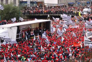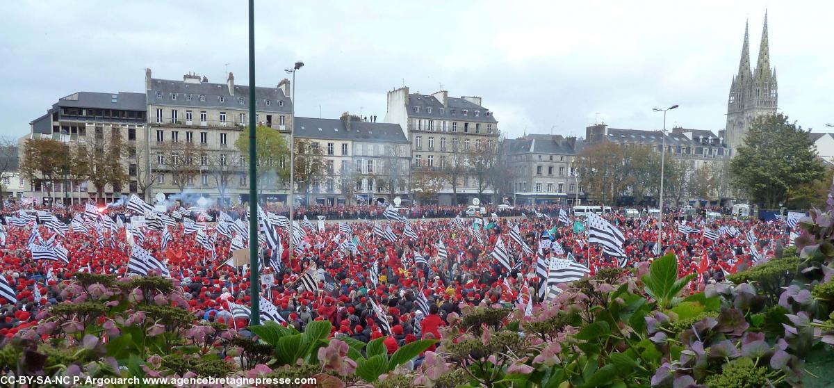 Le succès de la manifestation du 2 novembre à Quimper, dite des « Bonnets rouges », vient de trois éléments cumulés : peur du chômage, mécontentement des entrepreneurs et émotion créée par la mutilation d'un jeune homme par une grenade de la police, 8 jours avant. Deux points importants : présence de jeunes de - de 25 ans et le faible nombre de pancartes indiquait le manque d'habitude de manifester.