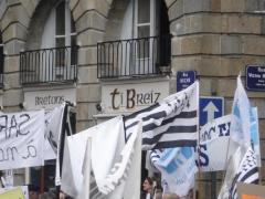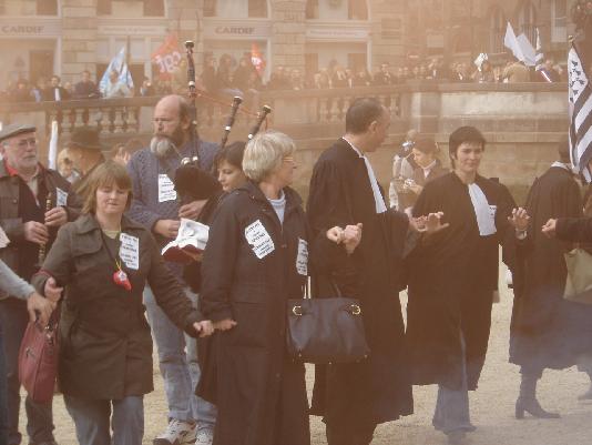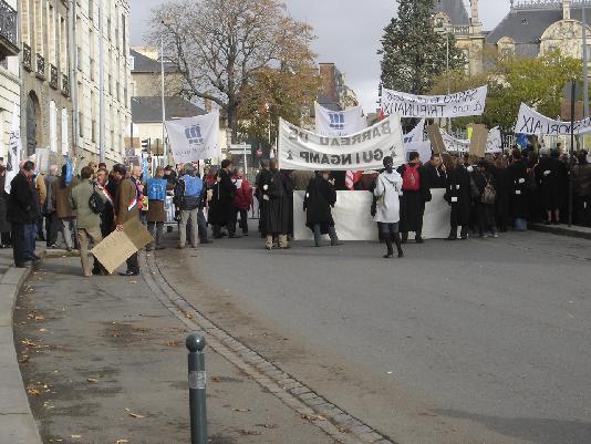 Partis de la mairie vers la préfecture, les manifestants dont un tiers en robes noires ont attendu le passage de la voiture de la Garde des Sceaux, Rachida Dati, avant de redescendre place du Parlement où les attendait comme d'ailleurs devant la préfecture, un cordon de CRS prêts à toutes éventualités. Les manifestants protestaient contre la réforme de la carte judiciaire. Les juristes de plusieurs TGI étaient venus de Morlaix, Guingamp et Dinan pour défendre leur tribunaux en passe d'être supprimés. Les syndicats FO et CFDT étaient aussi là pour protester contre la suppression de plusieurs prud'hommes et enfin les partisans de l'unité de la Bretagne étaient aussi venus pour s'assurer que l'unité judiciaire de la Bretagne qui comprend le tribunal de Nantes ne serait pas touchée (la région judiciaire bretonne est la dernière instance de la Bretagne historique à 5 départements). Certains défendaient tout cela à la fois et tout le monde semblait être d'accord pour conserver une justice de proximité ou du moins ne rien changer sans une concertation préalable — ce qui semble avoir fait défaut.