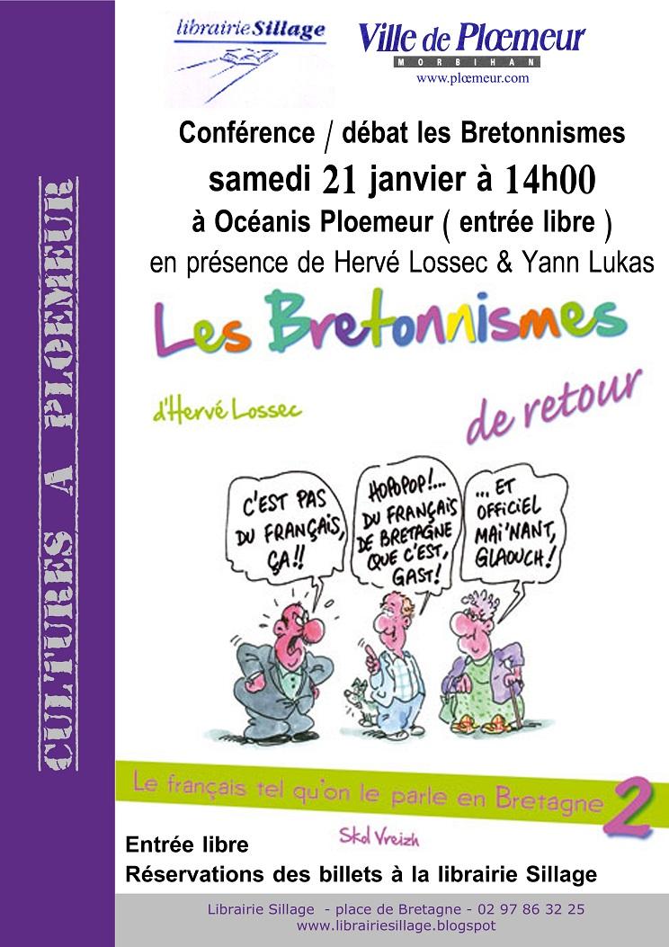 La librairie Sillage, en partenariat avec la ville de Ploemeur, propose une conférence-débat sur le thème des bretonnismes, en présence de Hervé Lossec et Yann Lukas, le samedi 21 janvier 2011 à partir de 14 h, salle Océanis à Ploemeur