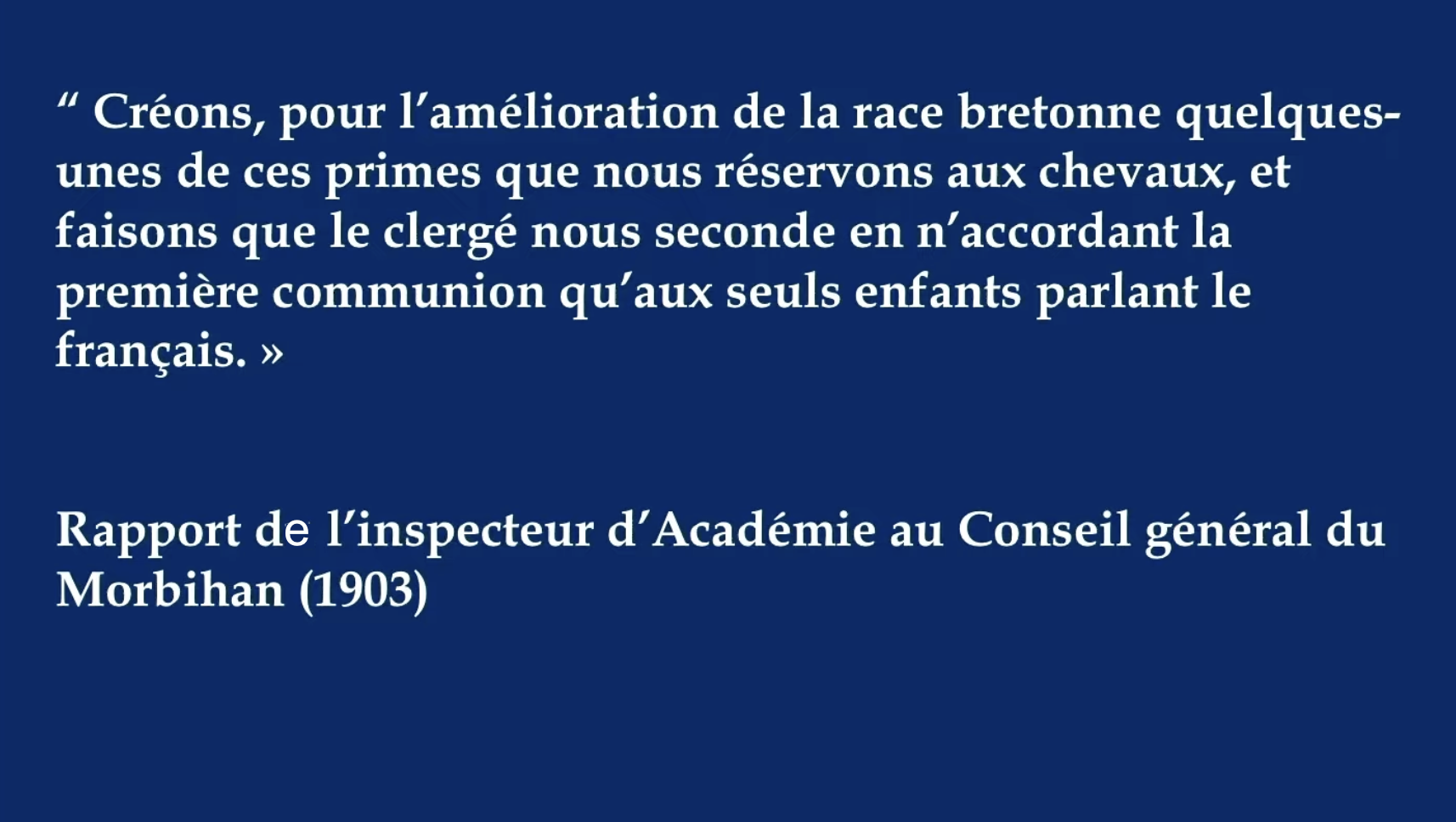 Aux XVIe et XVIIe siècles, les rapports des intendants royaux décrivent la Bretagne comme une région à civiliser. L’ordonnance de 1539 imposant le français comme langue officielle renforce l’assimilation forcée et la marginalisation des cultures locales. Sous la IIIe République, l’interdiction du breton à l’école et les punitions infligées aux enfants parlant leur langue maternelle (le fameux symbole) participent à la dévalorisation de l’identité bretonne.