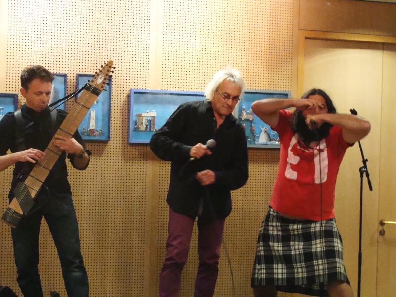 Un mini-concert, avant de se retrouver autour d'un verre, a permis de découvrir le “Chapmann stick”, un instrument de musique à cordes joué par Youenn Landreau. Puis Rachid, alias Claude Darmor, des Baragouineurs et Jean-Louis Jossic l'ont rejoint pour un Dans les prisons de Nantes endiablé et inoxydable.