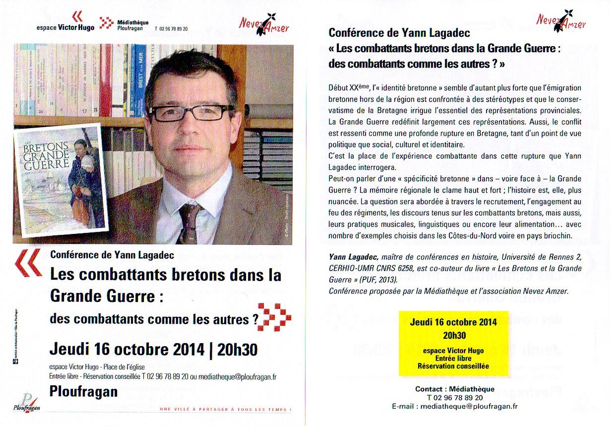 Nevez Amzer organisme conjointement avec la Médiathèque de Ploufragan ,une Conférence présentée par YANN LAGADEC sur le thème Les Combattants bretons dans la Grande Guerre : des combattants pas comme les
