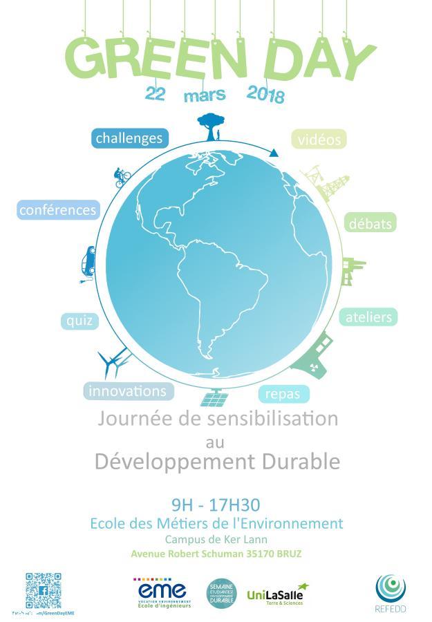 Le GREEN DAY est une journée conviviale et règlementaire pour l'enseignement supérieur permettant aux élèves de monter en compétences sur l'organisation et l'animation d'évènements Développement durable, de sensibiliser le public, le personnel et les élèves aux enjeux DD&RS (Développement durable et Responsabilité sociétale).