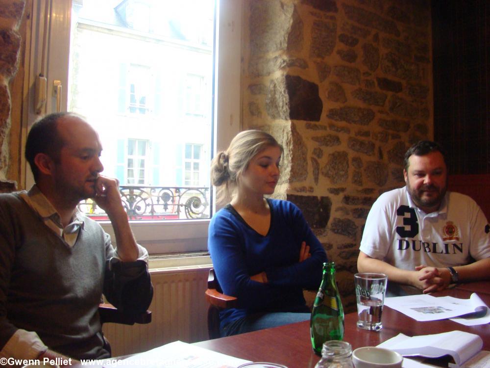Ce matin, au Ceili, à Kemper, avait lieu une réunion d'information sur le projet de déplacement à New-York, du 13 au 20 mars 2013 des 2 ensembles quimpérois, le Cercle Celtique Eostiged ar Stangala de Kerfeunteun et le Bagad du Moulin-Vert dans le cadre de la St-Patrick. Léna Bernard, chargée de communication du Bagad du Moulin-Vert, Stéphane Riou, du Bagad également et Gwen Le Viol, danseur au Cercle Eostiged ont exposé le concept.