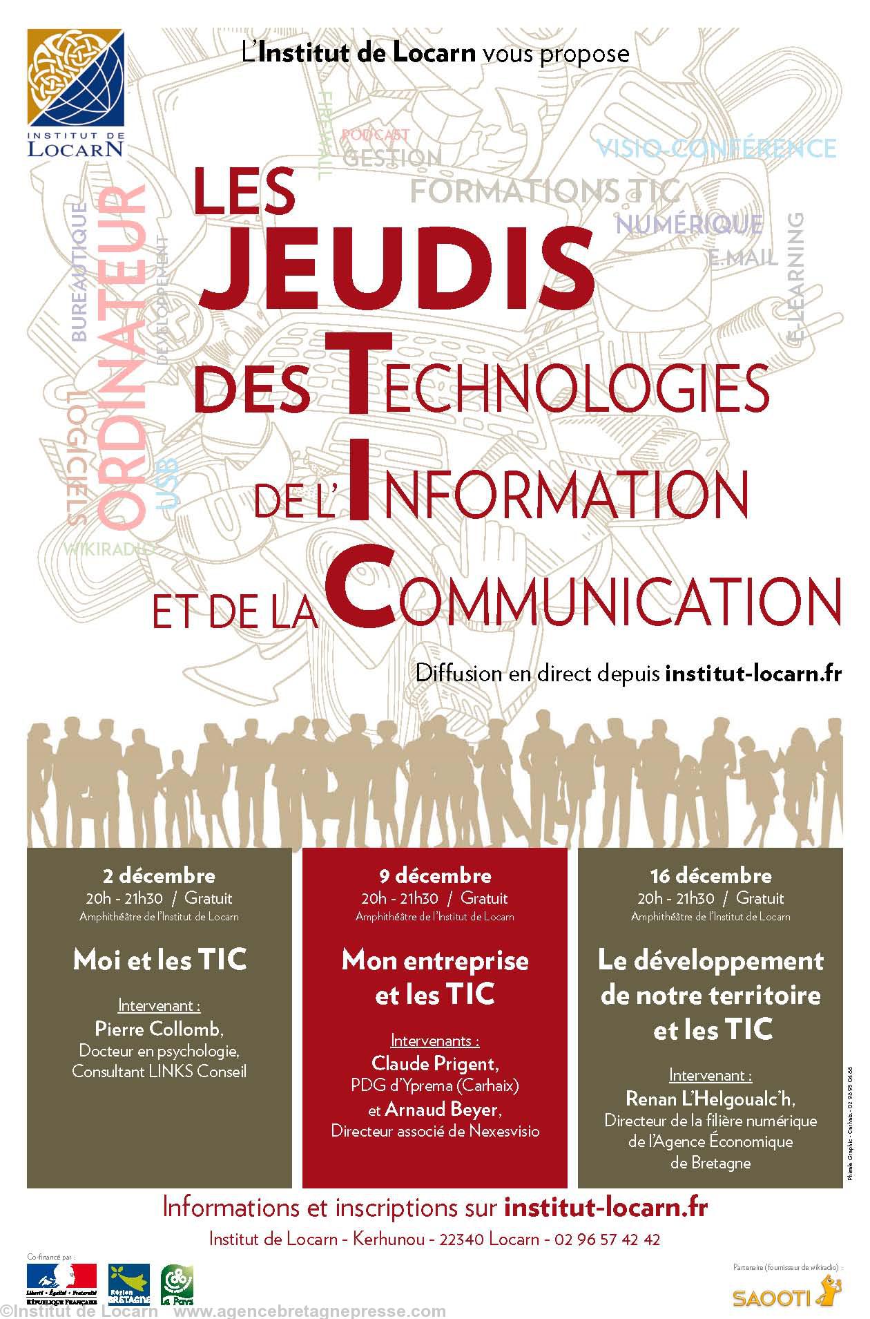 La prochaine rencontre des Jeudis des TIC aura lieu ce jeudi 9 décembre,de 20h à 21h30, à l'Institut de Locarn. Le thème, "Mon entreprise et les TIC" avec Claude Prigent et Arnaud Beyer,