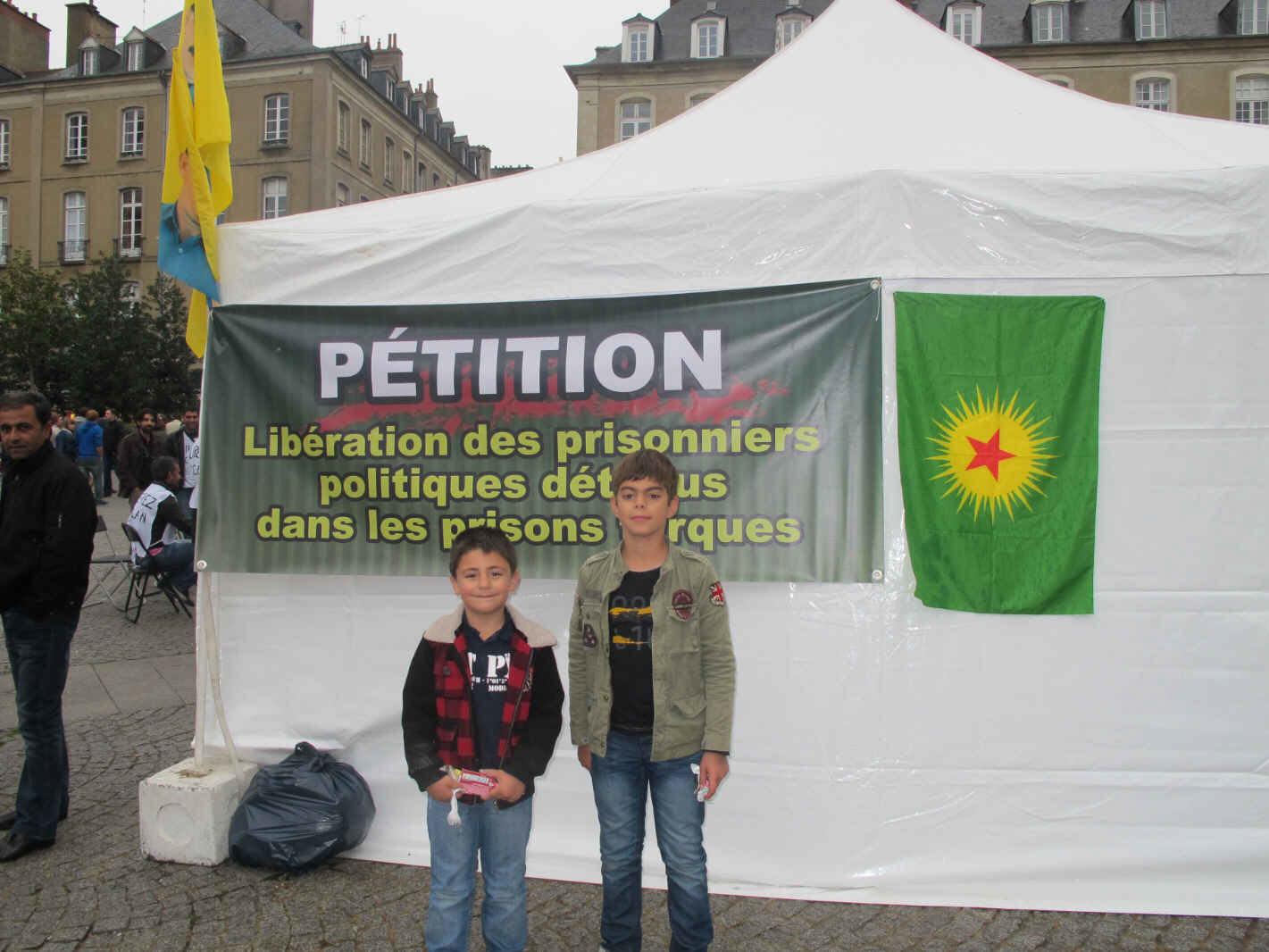L'association Amara, Maison du peuple kurde de Rennes, a continué son action lancée le 13 octobre (signature de la pétition en faveur de la libération d'Öcalan et de tous les détenus politiques) par une manifestation de trois jours et deux nuits place de la Mairie, du 19 au 21 octobre, durant lesquels 18 Kurdes, entourés de leurs familles et d'amis, ont observé une grève de la faim. De nombreux rennais se sont arrêtés, près de la tente, à commencer par Daniel Delaveau, maire de Rennes, manifestant son intérêt et sa solidarité. Il était accompagné d'Yves Préault, adjoint à la communication. Ana Sohier, conseillère municipale UDB, a tenu également à manifester sa solidarité, ainsi qu'Arnaud Molin, secrétaire de la section PCF de Rennes Métropole et Frédéric Bourcier, adjoint au maire de Rennes et Premier secrétaire de la fédération socialiste d'Ille-et-Vilaine, déjà signataire de la pétition qui a recueilli, durant ces trois jours, 1 700 signatures supplémentaires venant s'ajouter aux 3 000 déjà recueillies le week-end précédent. La Ville de Rennes suit avec attention les procès politiques d'Istanbul et de Diyarbakir qui concernent des maires, des avocats, des journalistes, et envisage d'envoyer des observateurs.