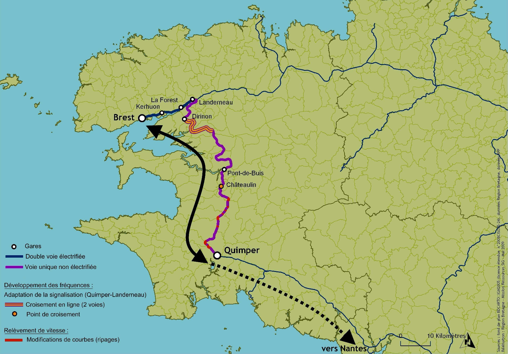 Le Conseil régional et le Conseil général du Finistère, en partenariat avec Brest Métropole Océane, Quimper Communauté, l'État et RFF, maître d'ouvrage, ont entrepris de financer des travaux qui permettront de réduire le temps de parcours à moins d'1 heure entre Brest et Quimper et d'augmenter le nombre de dessertes TER quotidiennes (12 AR/jour au lieu de 6 actuellement).