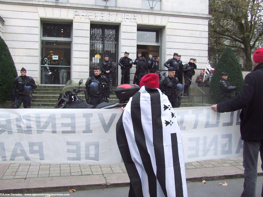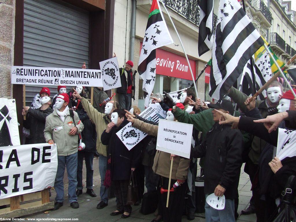 Alors que le Premier ministre vient à Nantes et Saint-Nazaire honorer de sa présence les 10e Assises de la mer (2), en présence du pitoyable Jacques Auxiette, encore président de l'encore région PdL, Bretagne Réunie (3) a décidé, elle, - de ne pas être là, devant lui (enfin, de l'autre côté des CRS) - donc de ne pas le chahuter « puisqu'il nous méprise, méprisons-le » déclare Jean-François le Bihan, Président de Bretagne Réunie. Cette action toute en symbole, est appelée à transcender le temps et les frontières. Ce masque blanc, anonyme, oui, on le retrouvera. Tant que la réunification ne sera pas réalisée.On veut nous enlever notre identité