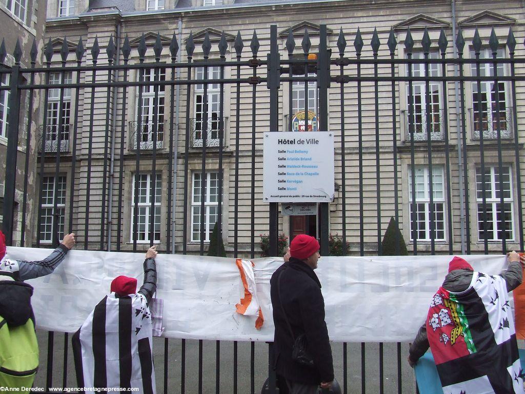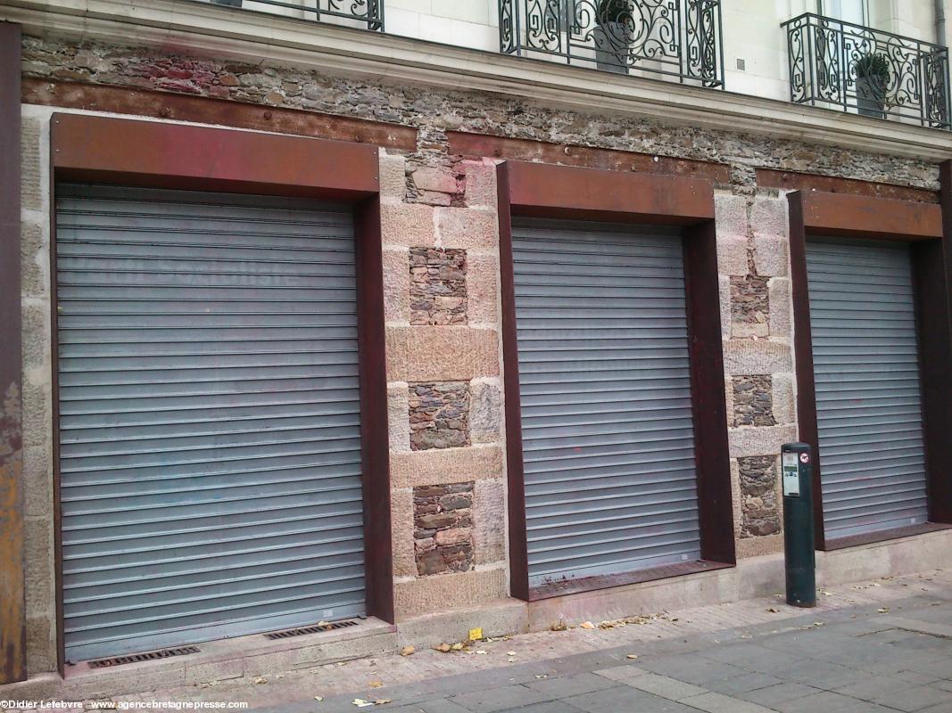 Il fallait le savoir, qu'il s'agissait du siège local du PS. Certes, il s'est fait taguer il y a peu, mais ici, rideaux de fer baissés, pas une enseigne, pas une rose ! On se serait cru devant une boutique fermée de longue date. La presse ne s'en est guère fait écho, hormis OF (9), mais aujourd'hui, plus d'une centaine de militants était devant ce siège du PS à Nantes. Dans le froid, durant 5 minutes, longues, pesantes, au silence seulement entrecoupé par les tramways, ils montrèrent du doigt le siège du PS, calmes, déterminés, devant des badauds étonnés. Une bonne moitié a chaussé ce fameux masque blanc. Le rassemblement s'est terminé par le traditionnel Bro gozh ma zadoù, certains militants décidant de visiter un peu la ville ensuite. Des photos illustrent ce périple : mairie, préfecture, conseil général, et... le Château des Ducs de Bretagne, evel just. Une militante me rapporte quelques clins d'oeil et "Blanche Hermine" fredonnée par certains CRS, discrètement. http://youtu.be/IaQPnDyz1vk où une autre vidéo présente l'ensemble de la journée, des Bonnets Rouges à proximité de la Cité des Congrès au siège du PS, puis devant les organismes cités ci-dessus et enfin, le Château des Ducs de Bretagne.Notes