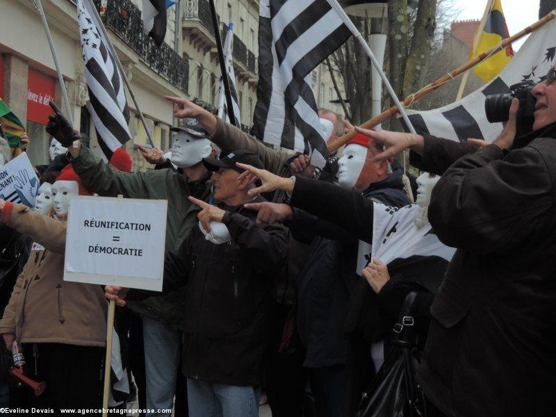 Plus d'une centaine de militants pro-réunification est devant le siège du PS à Nantes. Durant 5 minutes, longues, pesantes, au silence seulement entrecoupé par les tramways, ils montrent du doigt le siège du PS, calmes, déterminés. Une bonne moitié a chaussé ce fameux masque blanc. A l'occasion de la venue de Manuel Valls dans la cité des Ducs de Bretagne, ce 2 décembre, le mouvement pour la réunification a changé de visage à l'initiative du Comité local de Nantes de Bretagne Réunie. Les militants de Bretagne Réunie, rejoints par quelques Bonnets rouges et des militants de 44=Breizh se sont illustrés en montrant du doigt, en silence, les principaux responsables de cette loi inique, qui bafoue le bon entendement, et 70 % des 4,5 millions de Bretons en Bretagne (1) : les Socialistes. Certains militants sont venus de Quimper, d'autres d'Auray, d'autres de Morlaix. Beaucoup de la Presqu'Île et de Brière. Les Bonnets rouges, eux, étaient dès 8 heures devant la Cité des Congrès.Le mépris