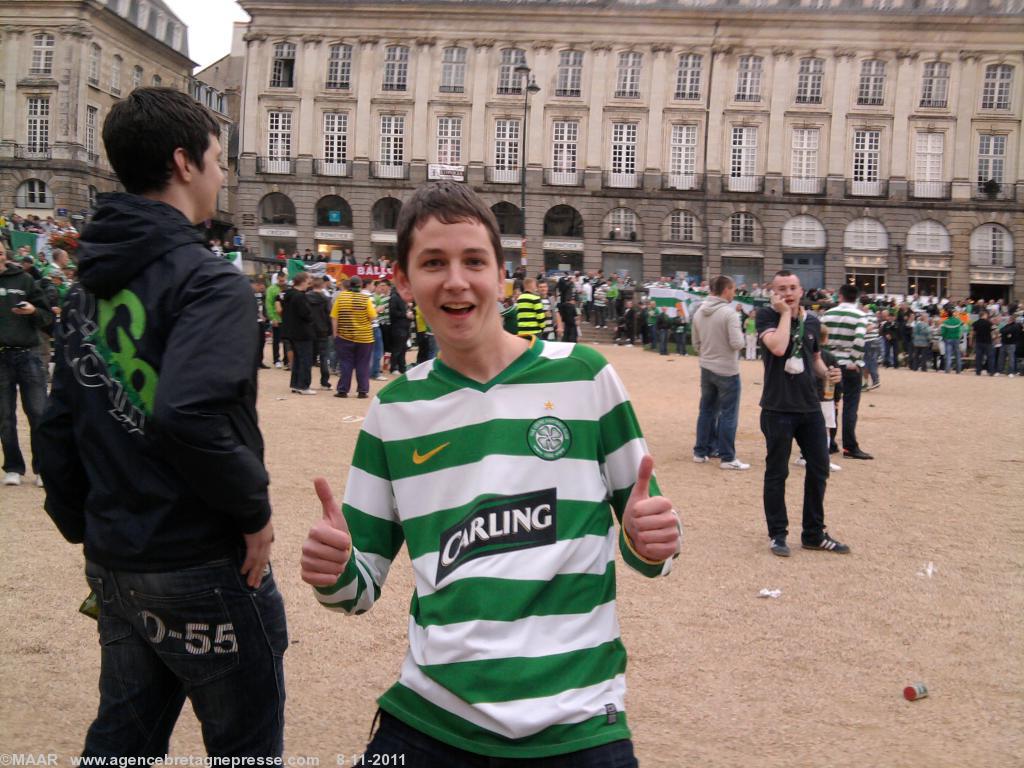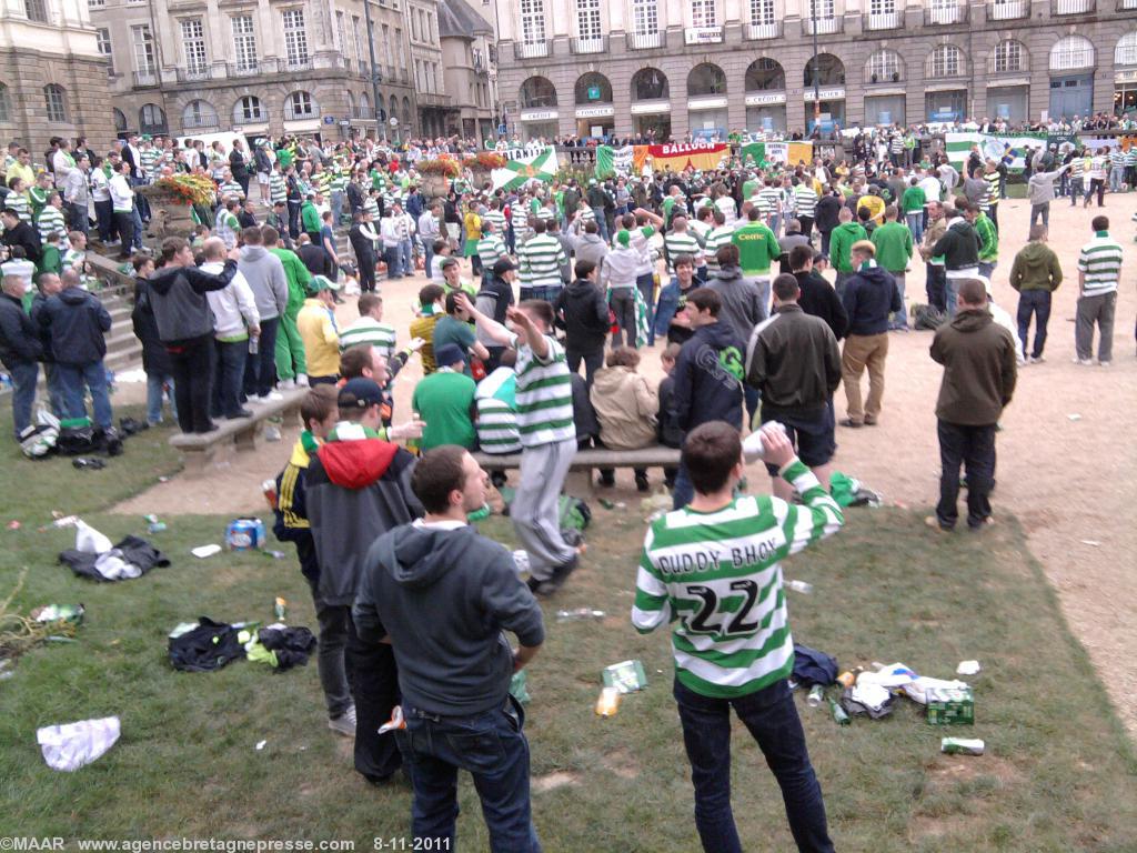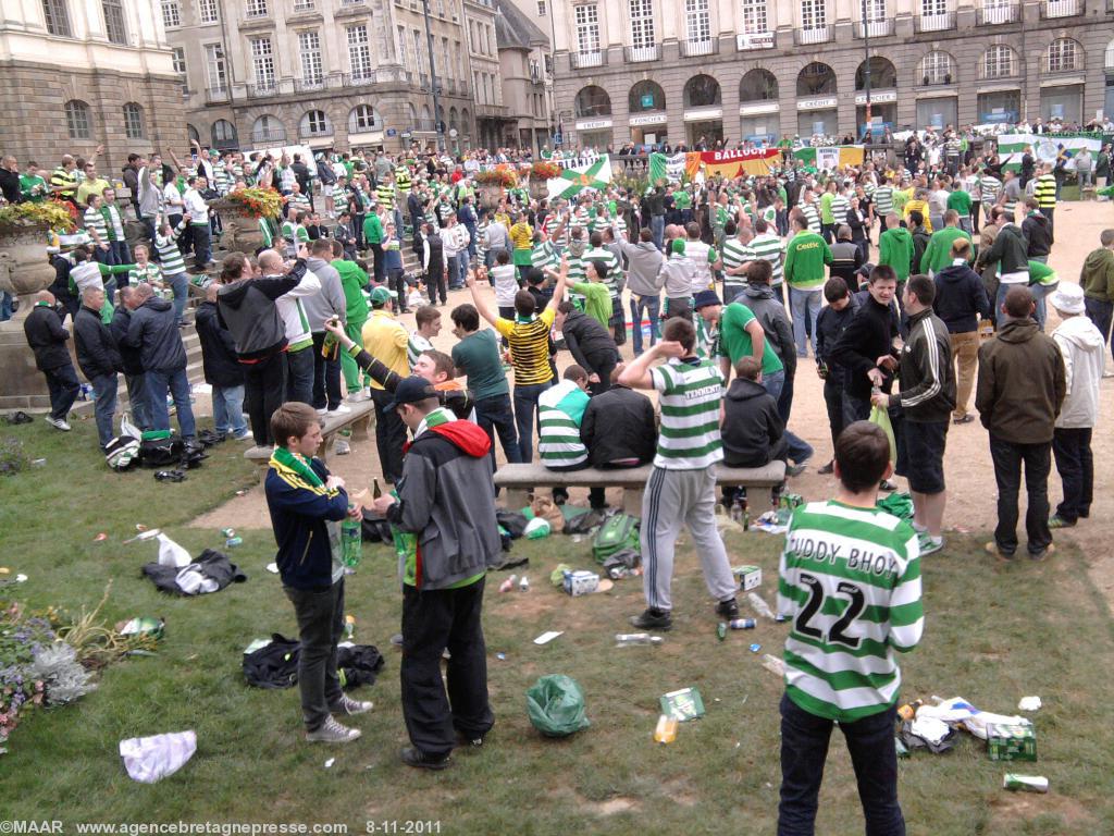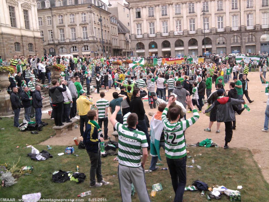 Place du Parlement dans une ambiance surréaliste et de ohé ohé, les supporters du Celtic de Glasgow ont animé Rennes centre. Le jardin de la place a vibré avec les aficionados