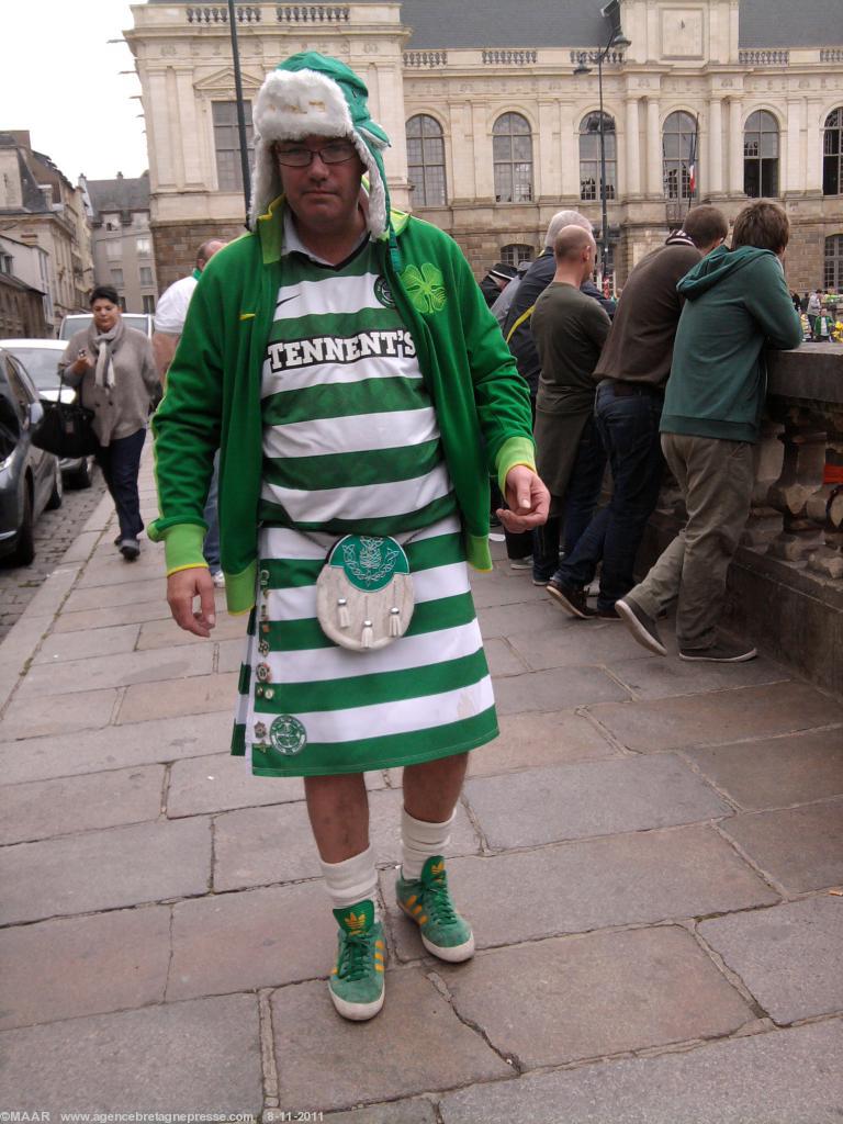 Place du Parlement dans une ambiance surréaliste et de ohé ohé, les supporters du Celtic de Glasgow ont animé Rennes centre. Le jardin de la place a vibré avec les aficionados du ballon rond. Les supporters du Glasgow Celtic Football Club sont arrivés dans la matinée pour leur rencontre avec le Stade rennais.
