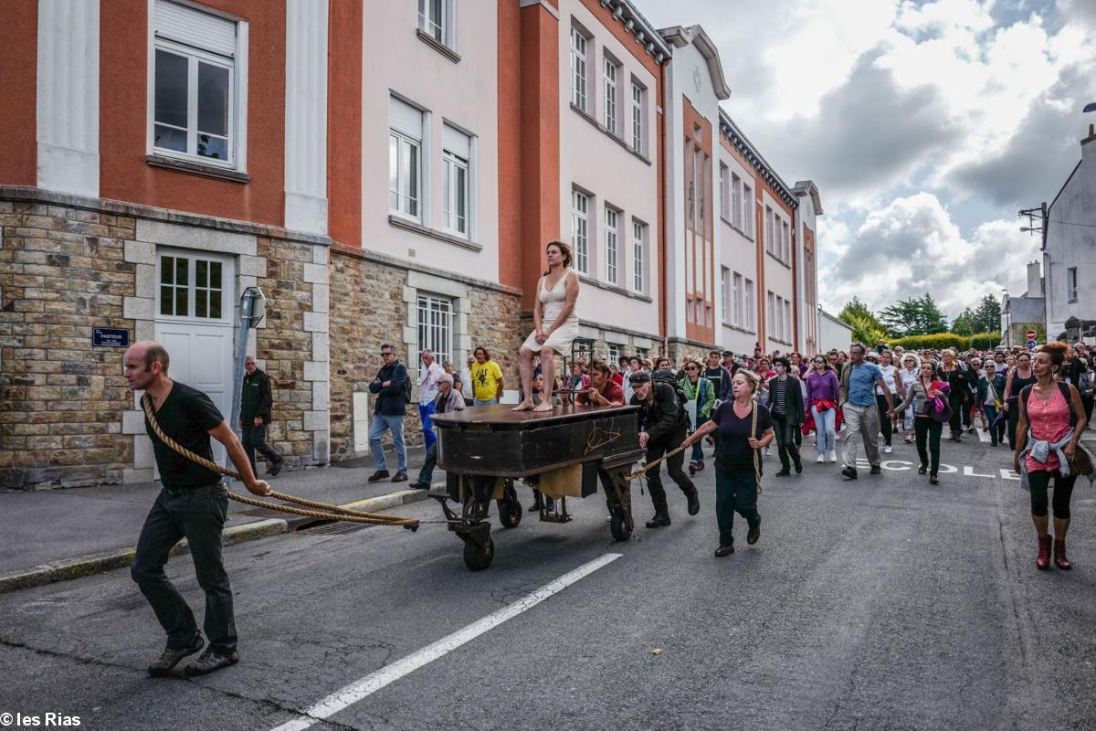 Ressusciter ces femmes qui n'ont pas écrit leur vie, qui n'ont pas parlé d'elles... Alors, comment parler de cette mémoire collective, de ces hommes et de ces femmes qui riaient de les voir tondre, de ces destins difficiles, pour elles, leurs enfants ? Comment faire le lien avec les chevelures de ces femmes que l'on cache, que l'on coupe, avec le corps des femmes tout simplement, objet de convoitise mais aussi territoire à conquérir, à soumettre, juste après la victoire du vote des femmes, les grèves de la faim des suffragettes, les droits élémentaires de la moitié des êtres humains sur cette planète ? La mise en scène est sobre, les tableaux différents, les acteurs incarnent des rôles étonnants (le petit fils qui revient sur les traces de sa grand-mère tondue, la vieille dame qui retrouve à Quimperlé les traces de Lili, sa meilleure amie, tondue, et la jeune fille qui elle aussi découvre un secret de famille...). La compagnie "les Arts Oseurs" vient du centre de la France, c'est leur deuxième partenariat avec les Rias. Le premier parlait des Français des banlieues, dans "Carnet de Famille". Avec les Tondues, la metteure en scène, Périne Faivre, a écrit un très beau texte. Pour elle le théâtre de rue, en ces temps hypersécuritaires est devenu un "vrai sport de combat". Un très bel hommage à la vie, à ces femmes, et un appel à la vigilance, à l'avenir de nos choix et de nos engagements...