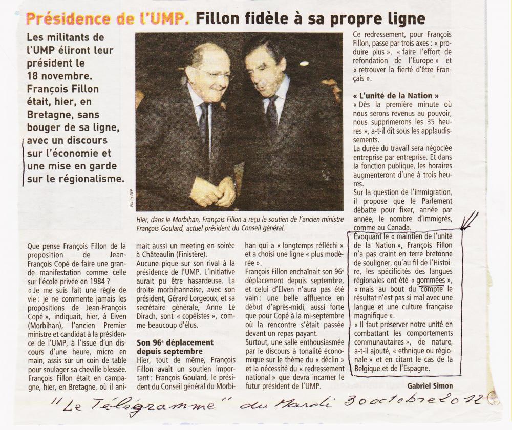 Connaissant votre engagement pour la défense de la langue bretonne et de l'identité de la Bretagne, nous vous faisons part de notre réaction à un article paru dans le Télégramme du 30 octobre dernier relatif a une intervention de François Fillon, peut-être futur Président de votre parti et dont vous soutenez la candidature, - cf. copie - Nous n'avons pas réagi immédiatement pensant à une mauvaise interprétation, mais compte tenu de l'absence de toute mise au point, nous aimerions avoir une explication : comment peut-on dans un même parti militer pour un nationalisme français à ce point outrancier et défendre les droits des Bretons ? Cette schizophrénie nous sidère. En effet, nous ne pouvons comprendre qu'un ancien Premier Ministre de la France, pays qui se réfère à chaque instant aux Droits de l'Homme puisse se permettre une telle déclaration. Si quelqu'un prenait l'initiative de proférer de telles incohérences en Chine sur les langues Tibétaine, ou Kurde en Turquie, cela provoquerait un tollé général de l'ensemble de la classe politique française ! Mais quand il s'agit des langues minoritaires de l'hexagone cela est ignoré ! Sans oublier qu'il contrevient aux signatures internationales de la France, membre fondateur de l'Europe dont elle oblige les membres à appliquer des lois qu'elle n'applique pas chez elle : CQFD, les impératifs économiques abyssaux nous poussent heureusement vers le fédéralisme européen. Il est temps que le monde politique français se réveille, cesse la chasse aux sorcières et prennent enfin le train à l'heure. Espérant que vous transmettrez notre réprobation à Monsieur Fillon, recevez nos salutations bretonnes.