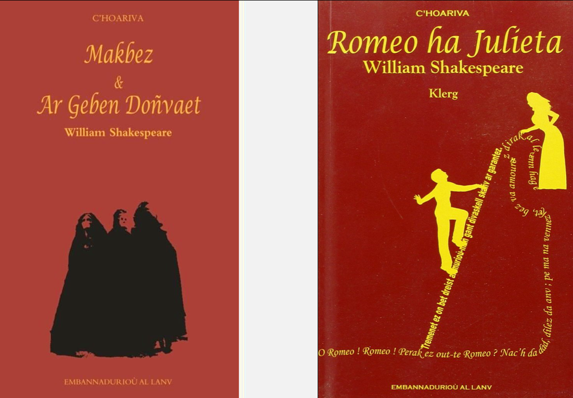 Pour les oeuvres de W. Shakespeare, l’CB peut citer cinq traductions : d’une part les trois livres publiés par Al Lanv en 2007 puis 2011 Makbez ( Macbeth) ; Ar Geben Doñvaet (La mégère apprivoisée), traduction de Y.L. Emili, Romeo ha Julieta, et Otello, les deux traductions de Marsel Klerg. D’autre part en 2014, chez Skol Vreizh : Komedienn mil luiet (The Comedy of errors), traduction de Marie-Hélène Morvan et S. Botrel. Et en 1999 (N° spécial 213 de la revue Brud nevez) Buhez ha maro ar Roue Yann (Vie et mort du Roi Jean), traduction de J.C. Miossec.Quelle autre œuvre de Shakespeare, pouvant notamment intéresser les troupes de théâtre en breton, retiendra l’attention des traducteurs ? Pourquoi pas Hamlet ? Ou Richard III, pièce qui donne l’occasion d’évoquer l’implication de la Bretagne de François II dans la guerre-des-deux-Roses ? Ou une pièce plus courte qui retient encore l’attention de notre monde telle que The Tempest ? Ne serait-ce pas un bon objectif pour le centenaire de Gwalarn ?