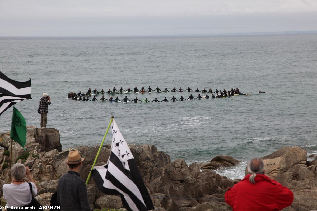Plusieurs centaines de personnes se sont rassemblées à la pointe de La Torche hier jeudi alors qu'une cinquantaine de surfeurs formait au delà des brisants un cercle hawaïen.