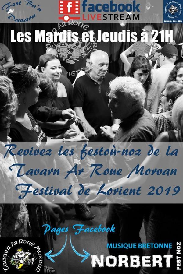 A l'heure du confinement, la Tavarn Ar Roue Morvan et Norbert Fest Noz vous proposent, pour égayer vos soirées, de revivre les festoù-noz de la Tavarn pendant le Festival de Lorient 2019. RdV les mardis et jeudis soir à 21H sur nos deux pages facebook Norbert Fest Noz https://www.facebook.com/norbertfestnoz.bzh/ et Tavarn Ar Roue Morvan https://www.facebook.com/tavarnarouemorvan/