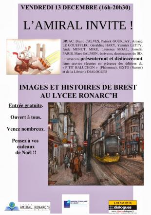 Le vendredi 13 décembre 2013, de 16 heures à 20 heures 30, le lycée Amiral Ronarc'h accueillera des dessinateurs, illustrateurs, écrivains et historiens dont l'½uvre porte sur Brest ou la Bretagne. Les visiteurs qui le souhaitent pourront faire dédicacer les BD ou les livres des auteurs suivants :