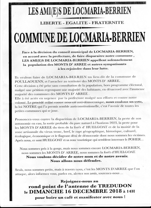 Une décision inique et antidémocratique fait que la commune va être rattachée à celle de Poullaouen. En outre, cette décision met en péril l'existence même de la communauté des Monts d'Arrée.
