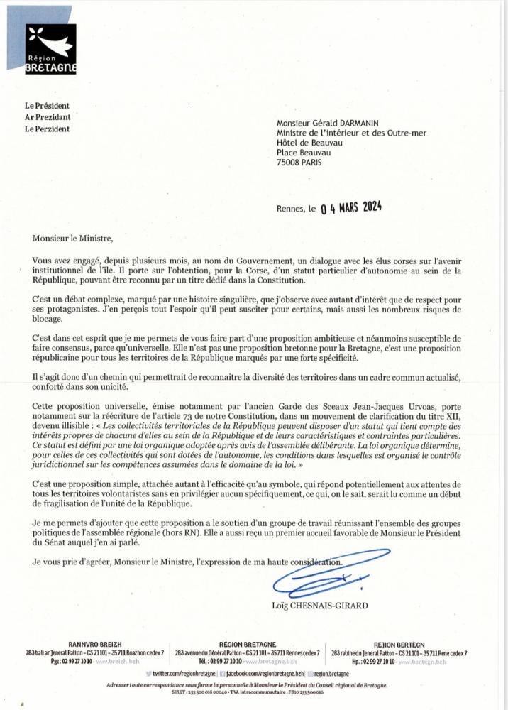 Loïg Chesnais-Girard propose la révision de l'article 73 de la Constitution « qui proposerait que les collectivités puissent s'organiser et proposer des organisations propres au regard de leur situation caractéristique et de leurs contraintes particulières. » Pour lui il faut « reconnaître la diversité des territoires dans un cadre commun. » LCG a écrit au président du Sénat et au ministre de l'Intérieur demandant plus d'autonomie pour les régions à la suite d'un voeu sur l'autonomie formulé par l'ensemble du Conseil régional à l'exception du RN. Il avait déjà émis cette requête à l'ex-Première ministre Elisabeth Borne.
