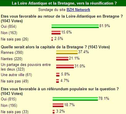Les résultats corroborent largement les sondages passés : 82% sont favorables à la réunification. Rennes passerait devant pour le choix de la capitale avec 37% alors que le partage des pouvoirs avec Nantes enregistre cependant 31% ; Nantes en tant que capitale n'enregistrant que 21%.