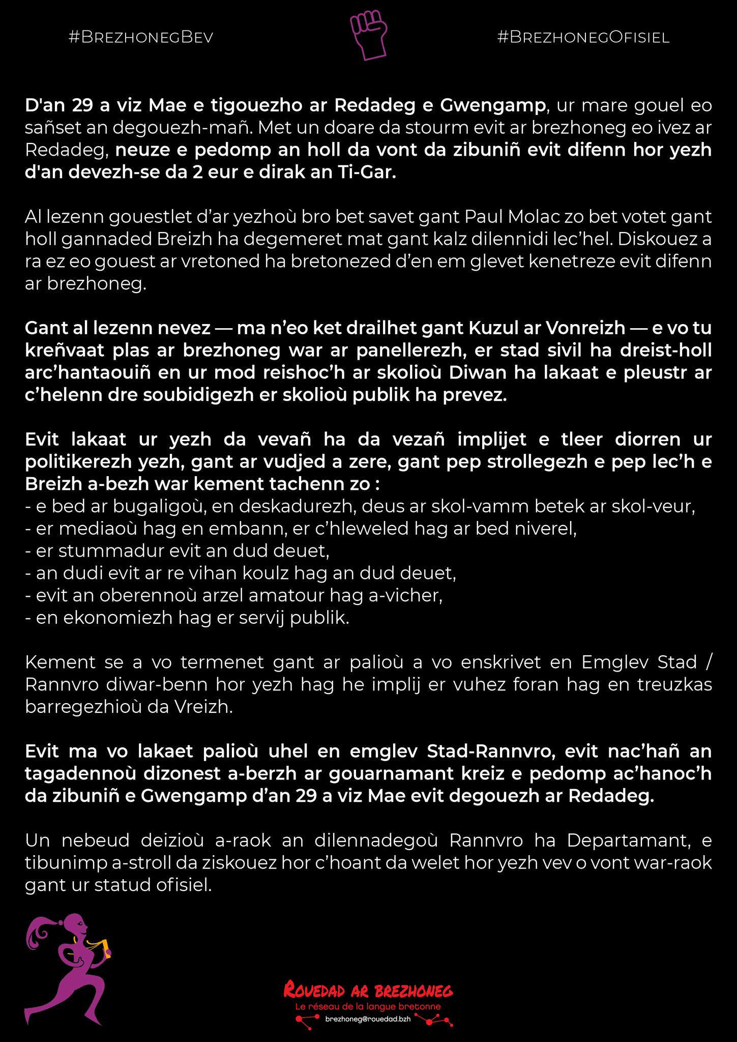 Objectif : donner à la langue bretonne la place qu'elle mérite. Celle d'une langue vivante, quotidienne, et pour laquelle il est nécessaire de mettre en place une politique linguistique ambitieuse avec les moyens financiers adéquats, dans chaque collectivité dans toute la Bretagne et dans tous les champs d’action.