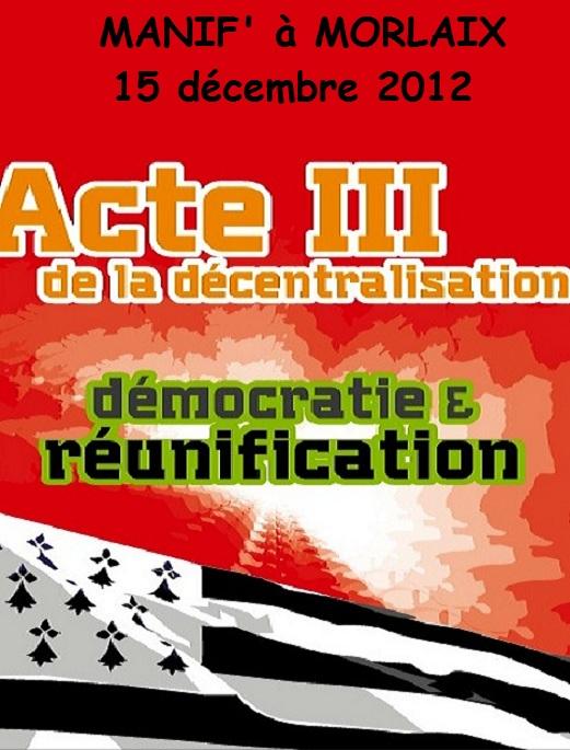 Voilà pourquoi nous manifesterons samedi 15 décembre à Morlaix, pour la Démocratie et la Réunification, dans la circonscription où est élue la ministre de la Décentralisation Marylise Lebranchu.Démocratie, car nous réclamons en tant qu'habitantes et habitants de la Bretagne le droit de décider de notre avenir institutionnel. Nous voulons nous-mêmes prendre en charge les politiques sociales, environnementales, éducatives, linguistiques, etc., à travers une nouvelle organisation démocratique garante d'un parlementarisme local et de l'équilibre des territoires.