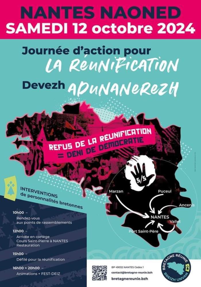 Bretagne Réunie Quimper/Kemper appelle les Bretons et les Bretonnes à participer à la manifestation en faveur de la réunification de la Bretagne le samedi 12 octobre 2024 à Nantes. Pour les personnes venant du Finistère, le rendez-vous est à 10h00 à l'aire de repos de Marzan (Morbihan) afin de faire route en cortège sur Nantes et se retrouver Cours Saint-Pierre avant le défilé.