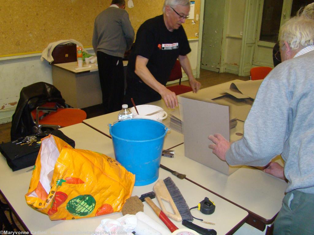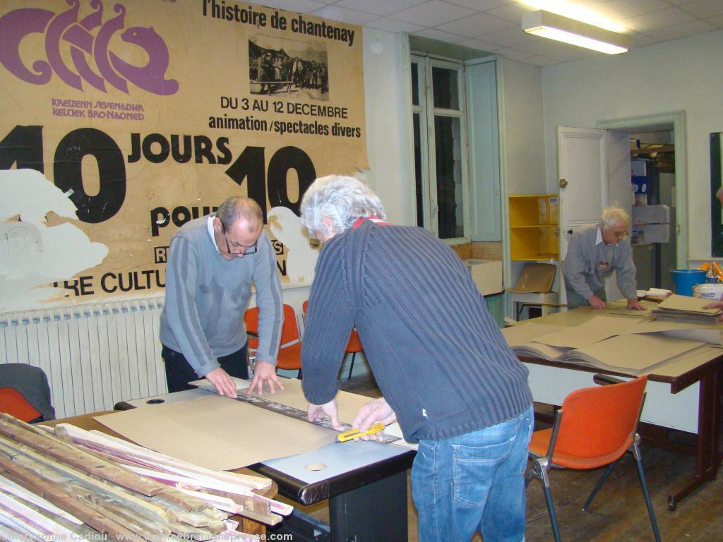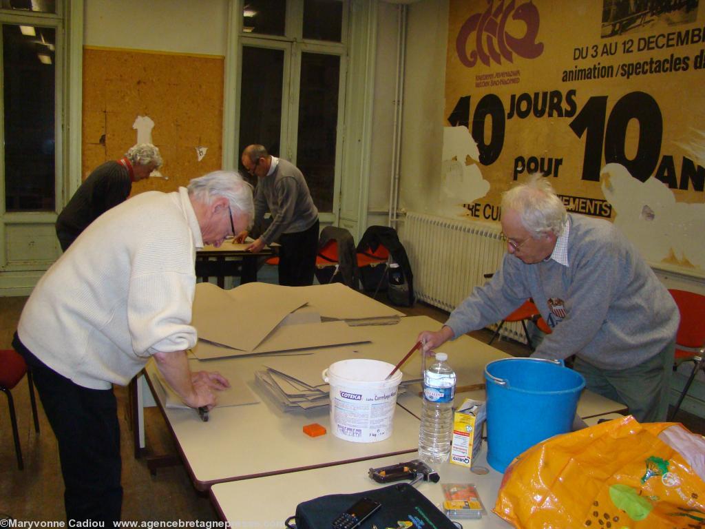 - Dans les coulisses de l\'atelier Bretagne Réunie à Nantes. Confection des panneaux pour Kemper le 19 mars 2012. Suite. À gauche pliage ; à droite encollage.