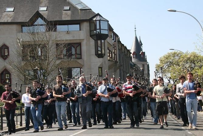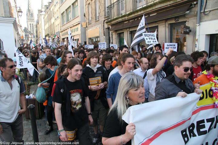 Le défilé ? Ouest France l'évalue entre 10.000 et 12.000 participants... évaluation plus précise impossible : il y en avait partout à la fois dans le vieux Quimper, y compris dans les “Ostalerioù” où il fallait bien s'arrêter de temps en temps pour se refaire la voix !!!! Le superbe concert qui s'ensuivit ne permettait pas plus de se compter [...] À part les centaines de gwenn-ha-du et autres drapeaux bretons et celtes (même basques), on ne voyait dans les rues que les 300 panneaux de Bretagne Réunie, avec photos dans le Ouest France 44 : “Breizh Unan bremañ diouzhtu !, Brezhoneg e ma Fac 44, Brezhoneg e ma tele 44, Pays de Loire er-maez deus 44”, ... hurlait la foule ! [...] Une fois de plus, le travail des “petites mains” du Comité local nantais de Bretagne Réunie a payé avec ces panneaux ! Nous avons su recueillir le respect breton de nos amis finistériens et autres bas-Bretons. [...] À part les bagadoù et chœurs bretons, on n'entendait que les slogans hurlés par les gosses bilingues des 5 départements : “Naoned e Breizh, Hep brezhoneg Breizh ebet,...”