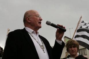 - Michel Chauvin au micro avant le départ. Il fut barde de la Gorsedd de Bretagne et porte son écharpe. Manifestation historique de Nantes le 19 avril 2014 pour la réunification de la Bretagne.