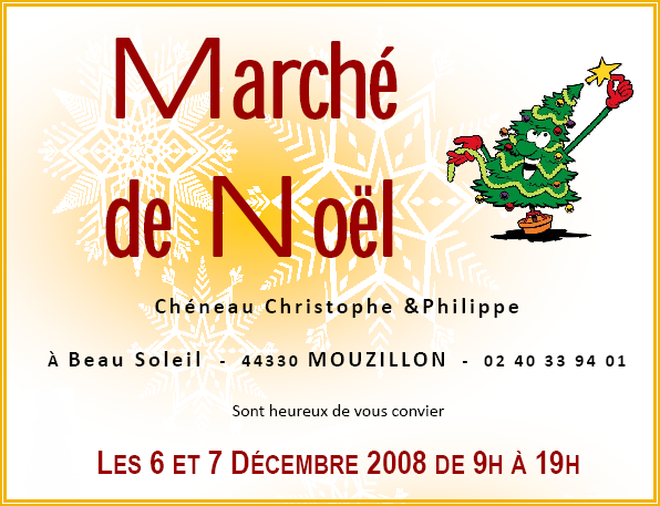 Christophe et Philippe Chéneau, vignerons en terre de muscadet, vous proposent de découvrir leur Marché de Noël à Beau Soleil en Mouzillon, près de Clisson avec des artisans producteurs. Ils présenteront leur gamme de vins ainsi que leur millésime 2008