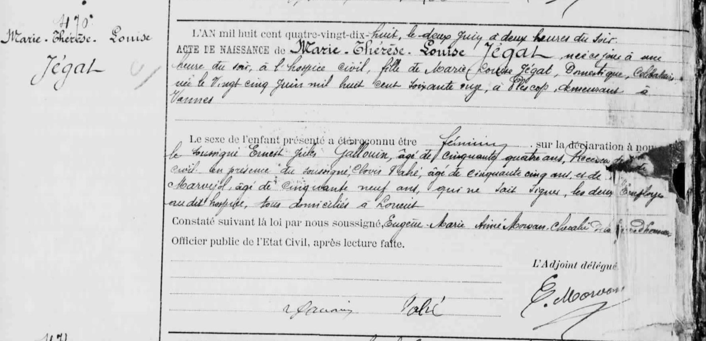On peut noter que, sur le registre des naissances obtenu par ABP aux archives départementales du Morbihan, toutes les personnes mentionnées ont une date de décès sauf... Marie-Thérèse.