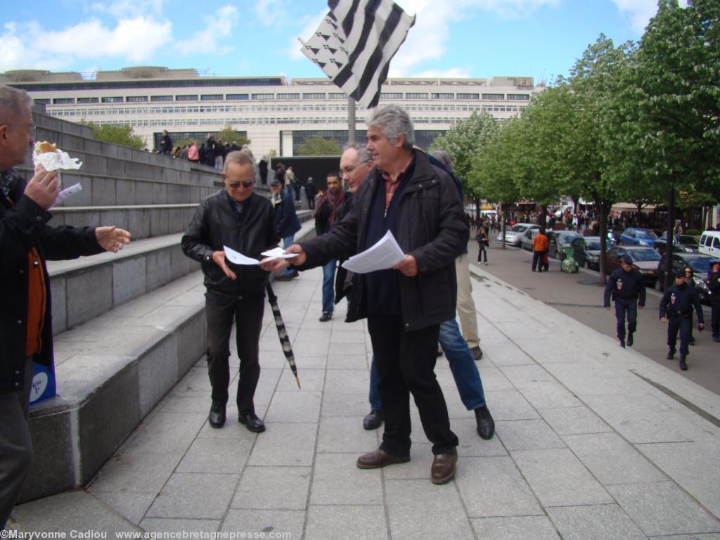 Gwenn ha du au vent entre les mains de Xavier, nous avons commencé à tracter, les uns aux gens dispersés qui rentraient à l'arrière du stade, les autres à ceux qui sortaient du métro, et à ceux qui se pressaient en masse devant les portes d'entrée principales. C'était rigolo d'essayer de fendre cette foule en mettant carrément notre tract entre les mains des gens et en leur disant " C'est pour la Bretagne et pour réunifier notre région divisée depuis Pétain, Pompidou et Mitterrand. Y en a marre de cette division qui nous est imposée depuis 70 ans ". Les bourgeois (socialistes) prenaient le papier avec un petit air de commisération avouant de temps en temps aimer la Bretagne car ils y ont une résidence (secondaire). Le " peuple de gauche ", moins méprisant, en revanche, soit hostile soit d'accord, mais réagissant, notamment les Français "récents". Les gens d'origine africaine étaient très intéressés par notre cause. Une des réflexions les plus drôles : " Mais qu'est-ce que vous faites ici ? Vous venez de Bretagne jusqu'ici distribuer vos tracts ? " Réponse : " Mais oui monsieur, les Bretons sont partout pour se battre contre cette situation inadmissible ". Les plus méprisants : les VIP prenant les tracts que je distribuais avec un mélange d'indifférence et de dégoût. Une Savoyarde est venue vers nous en nous félicitant : elle va nous envoyer l'adresse d'une association régionale de Savoie. Un mot sur nos deux compatriotes de l'UDB Paris qui ont tracté avec nous : pleins d'énergie, sympathiques et convaincus. Je vais les faire venir aux réunions de notre comité local de Paris. Pour terminer, une dernière touche d'humour : les deux CRS de passage à côté de Maryvonne. Non seulement ils ont pris notre tract mais ils sont accepté de se faire prendre en photo (et qu'elle soit publiée sans floutage) en nous souhaitant bonne chance. L'un des deux était franc-comtois, l'autre lorrain !