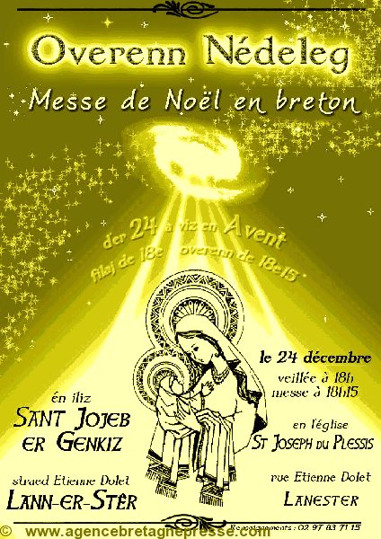 Le 24 décembre à partir de 18 h, une veillée de Noël suivie de la messe est proposée, en breton. Cela se passe à l'église Saint-Joseph du Plessis, rue Étienne Dolet à Lanester (56). Overenn Nedeleg en iliz Sant Jojeb er Genkiz (Lann er ster - 56. De 6 e d'en noz : filaj, hag overenn da 6 h 15).