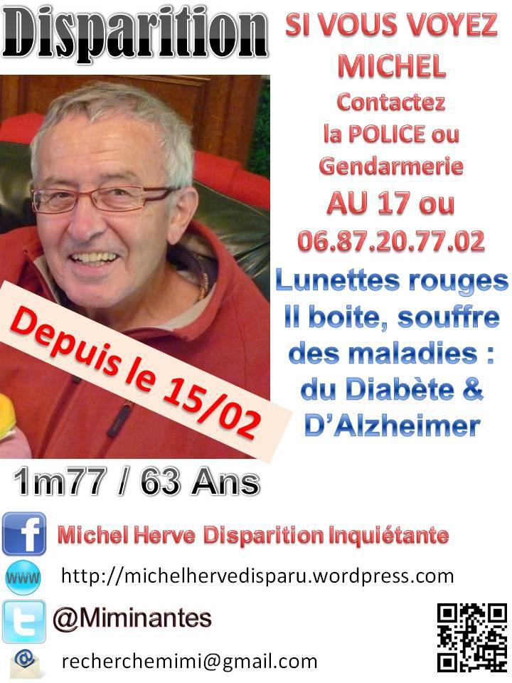 Michel Hervé, 63 ans, atteint de la maladie d'Alzheimer et souffrant de diabète, a disparu en partant à pied de son domicile de Saint-Herblain le 15 février 2011, sans pièce d'identité, ni téléphone portable ni son traitement, ni moyen de paiement.