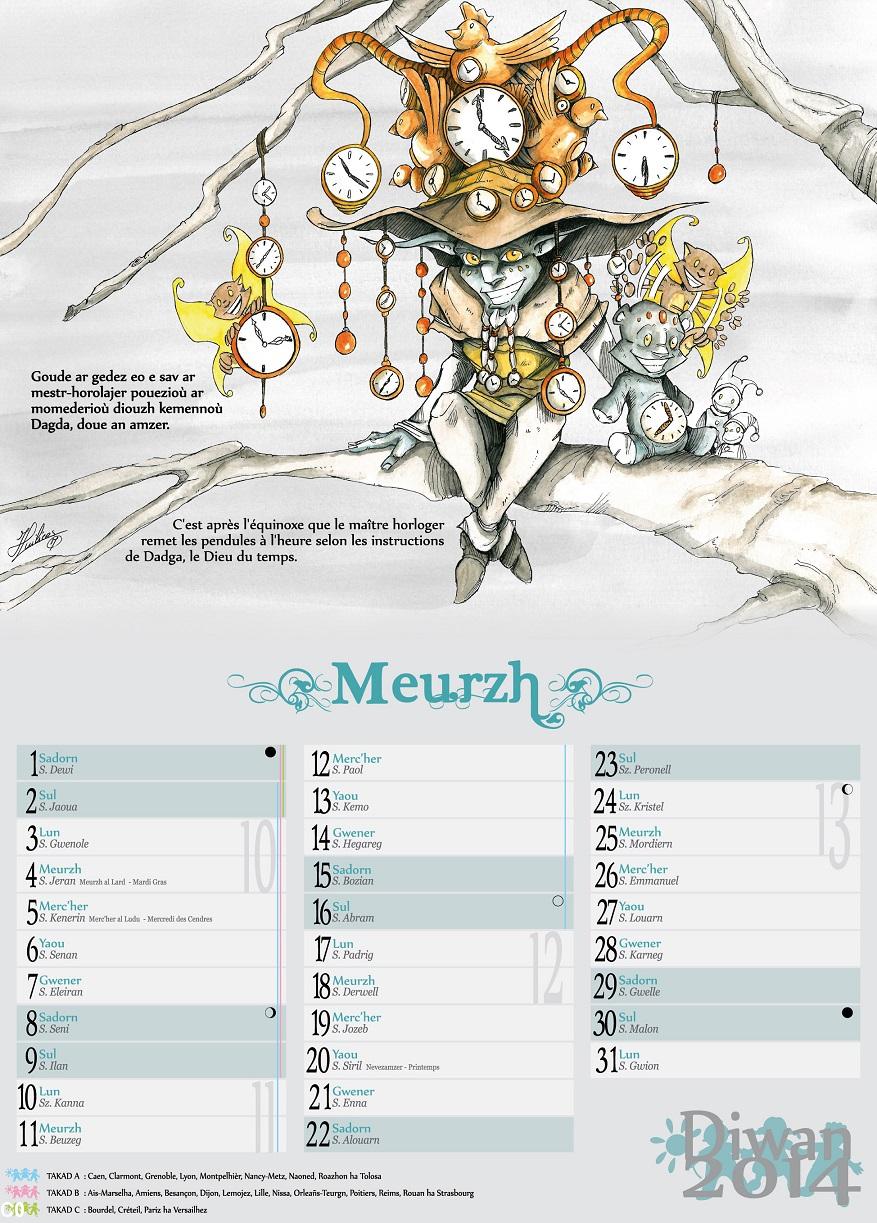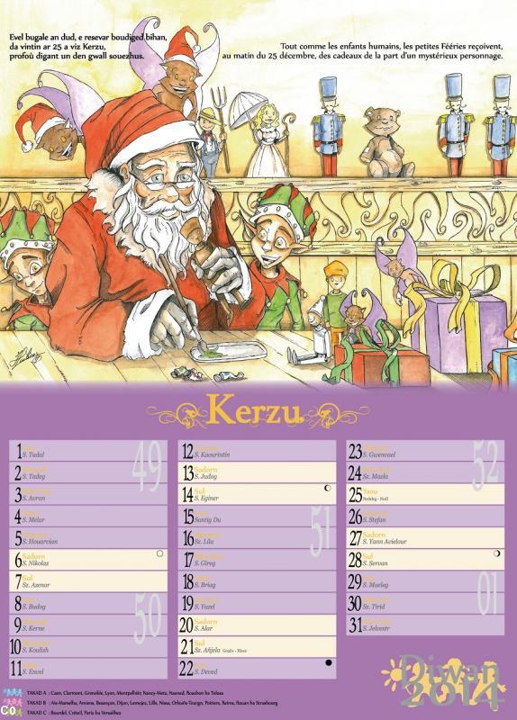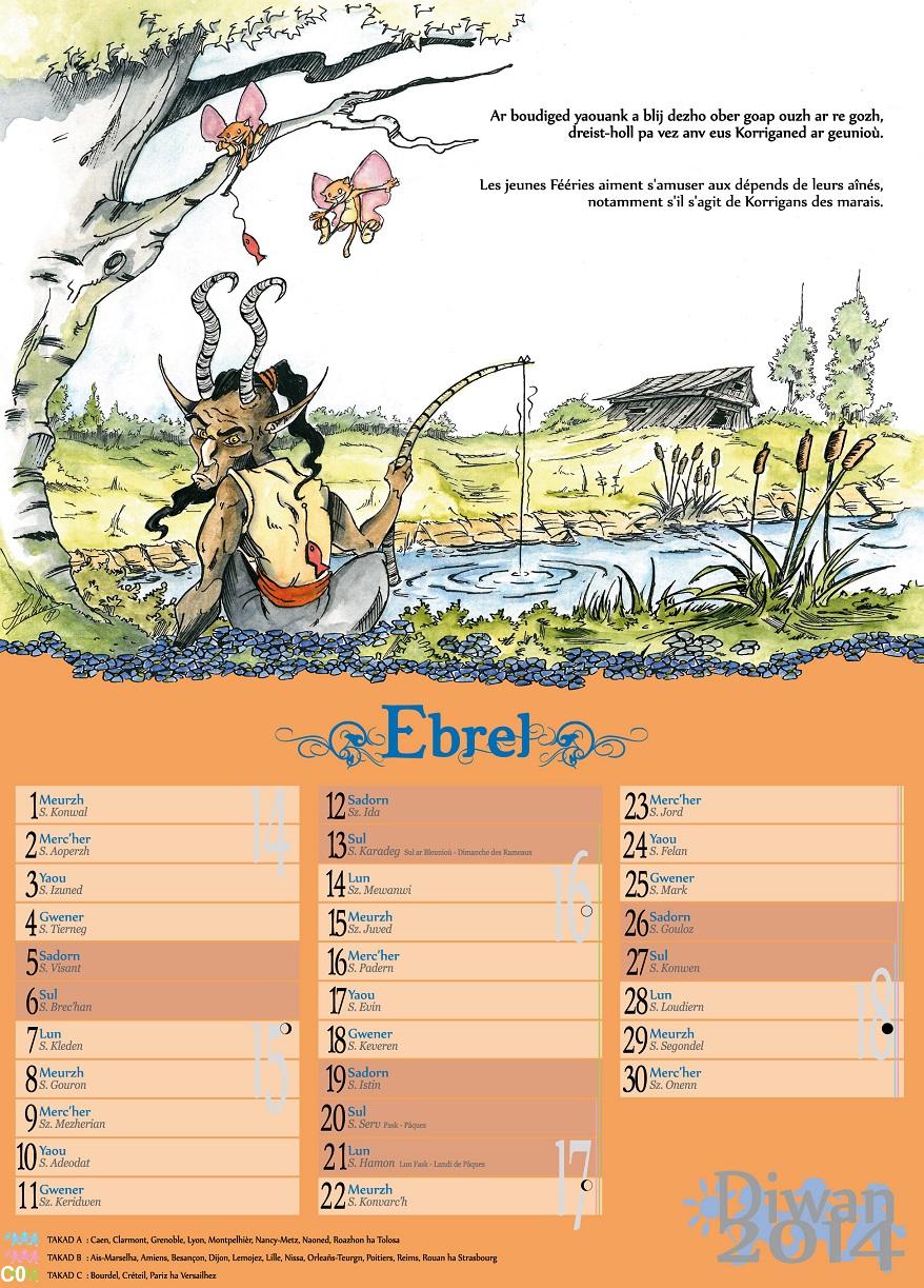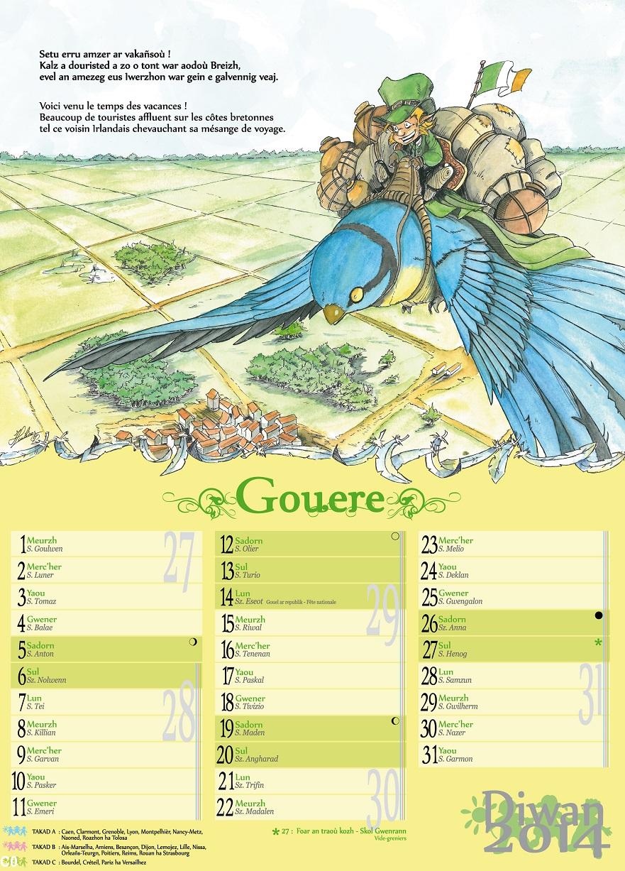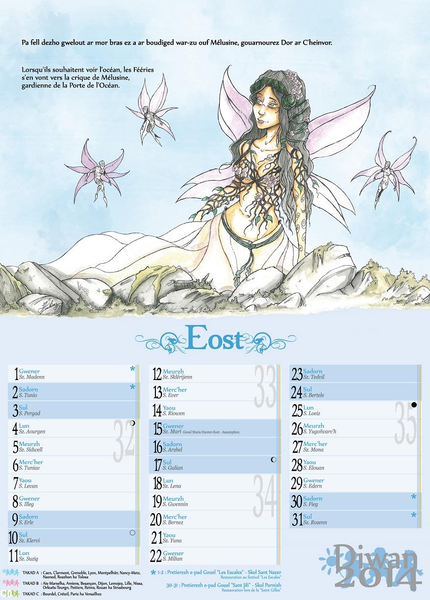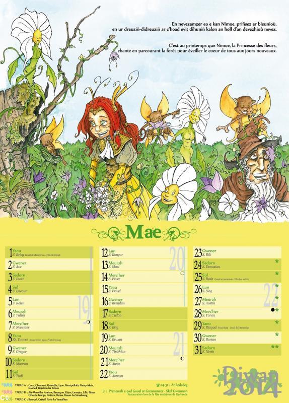 Chaque année le réseau des écoles Diwan (3) propose un calendrier à la vente pour soutenir financièrement ses écoles associatives. Il s'agit d'un concours lancé au sein des écoles. Celle qui sera sélectionnée recevra la moitié des bénéfices pour continuer à développer son école et soutenir le réseau qui est constitué de 58 établissements allant de la maternelle au lycée, dans un enseignement entièrement en breton. Les écoles sont associatives et gérées par les parents (ce sont eux qui emploient et paient le personnel non enseignant grâce aux différentes manifestations : crêpes, galettes, diners kig ha farz, vide-grenier etc.). Concernant le calendrier 2014, l'école de Saint-Nazaire est sortie gagnante grâce aux illustrations féériques de son artiste local Mickaël Huiliers. Alors si vous aimez la Bretagne et comme nous, si vous pensez qu'il est important de défendre la langue bretonne afin qu'elle ne devienne pas une langue morte, n'hésitez plus, soutenez les écoles Diwan en achetant ce magnifique et original calendrier !!! (Anne-Sophie Guillonnet, initiatrice du projet).Le calendrier Diwan