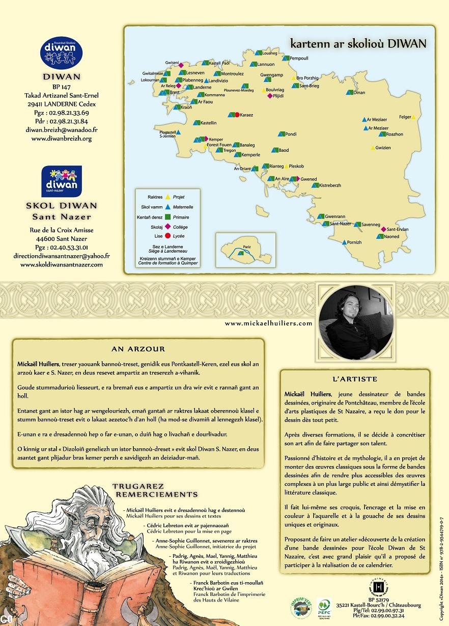 Mickaël Huiliers (1), jeune dessinateur de bandes dessinées, originaire de Pontchâteau, membre de l'école d'arts plastiques de Saint-Nazaire, a reçu le don pour le dessin dès son plus jeune âge. Après diverses formations, il se décide à concrétiser son art afin de faire partager son talent. Passionné d'histoire et de mythologie, il a en projet de monter des oeuvres classiques sous la forme de bandes dessinées afin de rendre plus accessibles des oeuvres complexes à un plus large public et ainsi démystifier la littérature classique. Il fait lui-même ses croquis, l'encrage et la mise en couleur à l'aquarelle et à la gouache de ses dessins uniques et originaux. Proposant de faire un atelier " découverte de la création d'une bande dessinée " pour l'école Diwan de Saint-Nazaire (2), c'est avec grand plaisir qu'il a proposé de participer à la réalisation de ce calendrier. (Texte extrait du calendrier).À propos de Diwan et son calendrier 2014